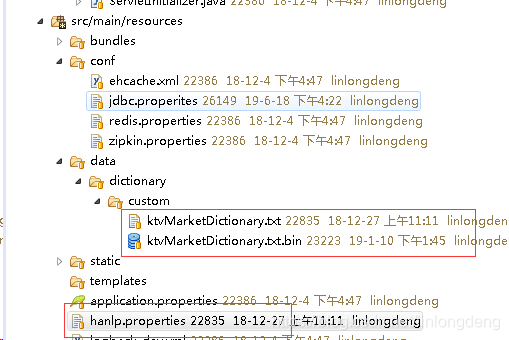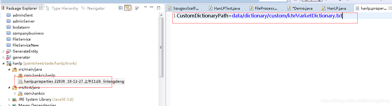 这其实还不够,主要是这种txt格式的,在jar包是不能写文件的,所以要转换成hanlp最后用的的bin文件,怎么办,这就要下载他的源代码,https://github.com/hankcs/HanLP,把自定义词典配置在hanl.properties文件,
