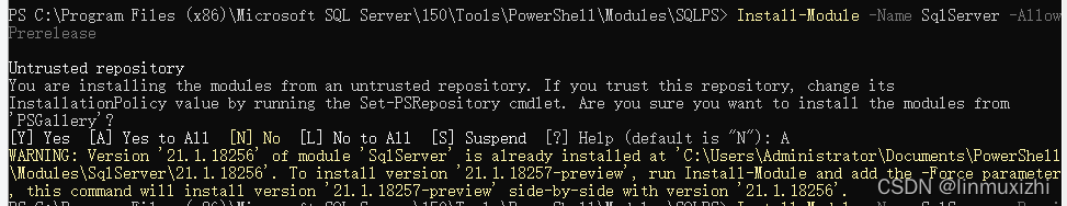 标题: 找不到“SqlServer”模块 --------------- 在此计算机上找不到任何 SQL Server cmdlet。