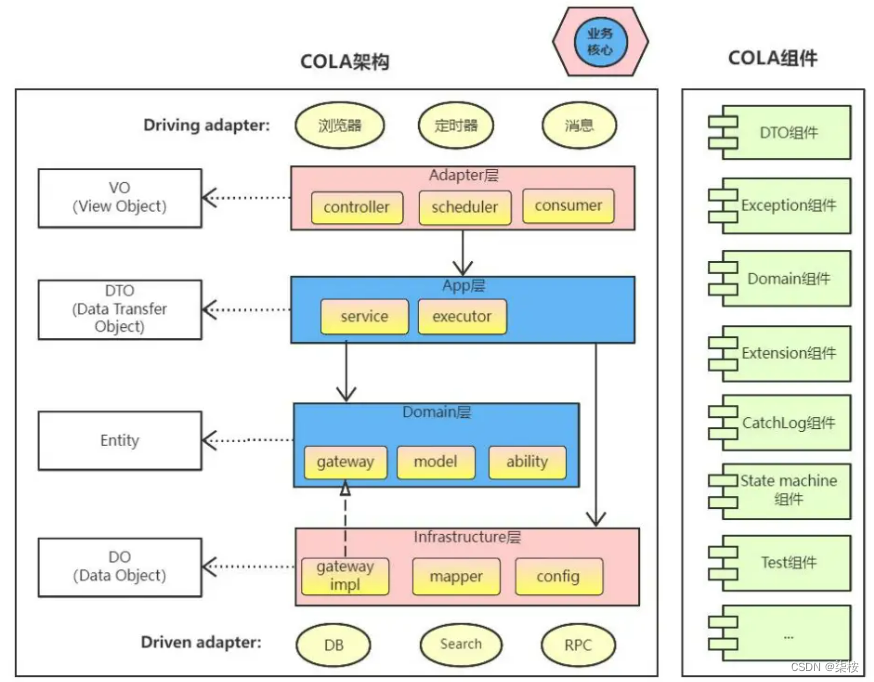adapter层分为SDK和web,controller依赖web,订单、库存、物流等服务在domain层,adapter层依赖APP层,APP层依赖Domain层,infrastructure层反方向依赖domain层(依赖倒置),基础设施层:各种数据库、rpc调用、缓存等,反向依赖的原因:假如domain层的订单服务,需要OrderDao的接口,包含:order,search,delete等方法,操作的时候针对接口编程,domain层调用的是OrderDao的接口的order方法,在domain层只能看到OrderDao.order()方法,order()方法的具体实现在基础设施层,在该层调用MySqlOrderDao,实现order,search,delete等方法,当数据量大了,需要分库分表,引入NoSql(HBase、MongoDB),特点:高弹性,不存在分库分表。此时将MySqlOrderDao接口替换为NoSqlOrderDao接口,在domain层看到的只有OrderDao.order(),而不会看到OrderDao的具体实现。