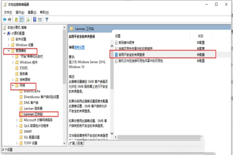 3、打开本地组策略编辑器后,按照“计算机配置-管理模板-网络-Lanman工作站”这个顺序来找到Lanman工作站这个程序;