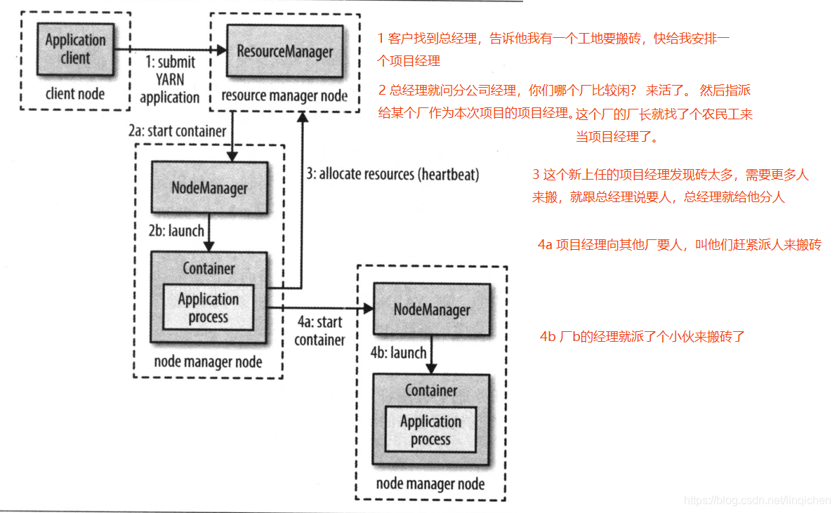 container :打工仔: 具体干活的人,有体力限制的(内存/cpu) 。一个容器可以是unix进程(默认), linux cgroup,取决于yarn的配置。