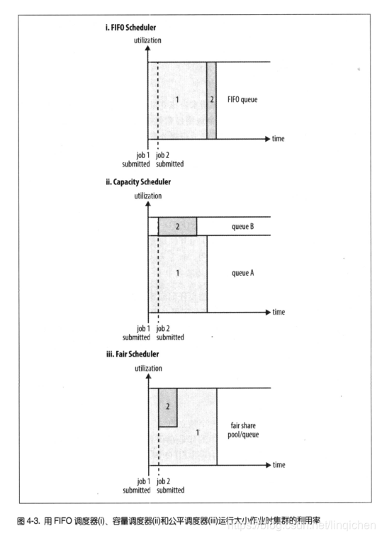 | Capacity scheduler | 一个独立的专门作业保证小作业一被提交就马上运行 | 小作业得到额外照顾 | 集群利用率下降,大应用运行速度下降 |