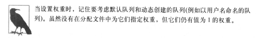 每个组织被分配一个专门的队列,每个队列被配置为可以使用一定量的集群资源。