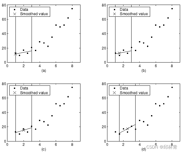 随着平滑过程从数据点到数据点的进行,跨度不会改变。然而,根据最近邻居的数量,回归权重函数可能对要平滑的数据点不是对称的。特别地,曲线(a)和(b)使用不对称权重函数,而曲线(c)和(d)使用对称权重函数。