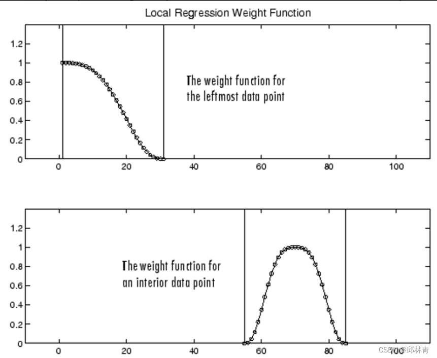 最后,通过回归中使用的模型来区分这些方法:lowess使用一次多项式(对应MATLAB工具箱中的linear polynomial),而loess使用二次多项式(对应MATLAB工具箱中的quadratic polynomial)。