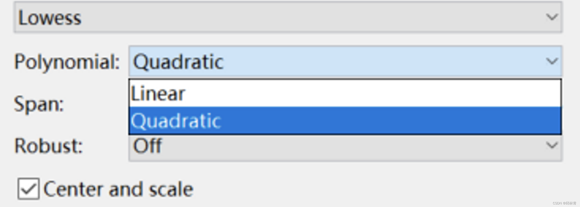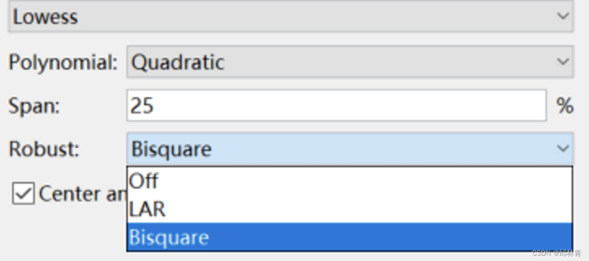 x是与要平滑的响应值相关联的预测值,xi是由跨度定义的x的最近邻,d(x)是x到跨度内最远预测值的横坐标距离。权重具有以下特征: