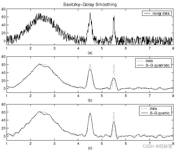 Savitzky-Golay滤波方法通常用于频率数据或光谱(峰值)数据。对于频率数据,该方法在保留信号的高频分量方面是有效的。对于光谱数据,该方法在保留峰值的较高矩(如线宽)方面是有效的。相比之下,移动平均滤波器倾向于滤除信号的高频成分的很大一部分,并且它只能保留峰值的低阶矩,例如质心(还是形心)。然而,Savitzky-Golay滤波在抑制噪声方面不如移动平均滤波器成功。