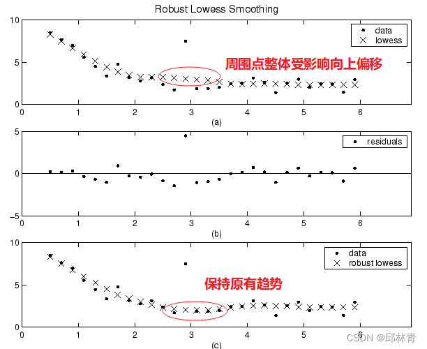 曲线图(a)显示,异常值影响几个相邻数据的平滑值。图(b)表明,异常值的残差大于六个中值绝对偏差。因此,该数据点的鲁棒权重为零。曲线图(c)显示了与异常值相邻的平滑值反映了数据正常的趋势。