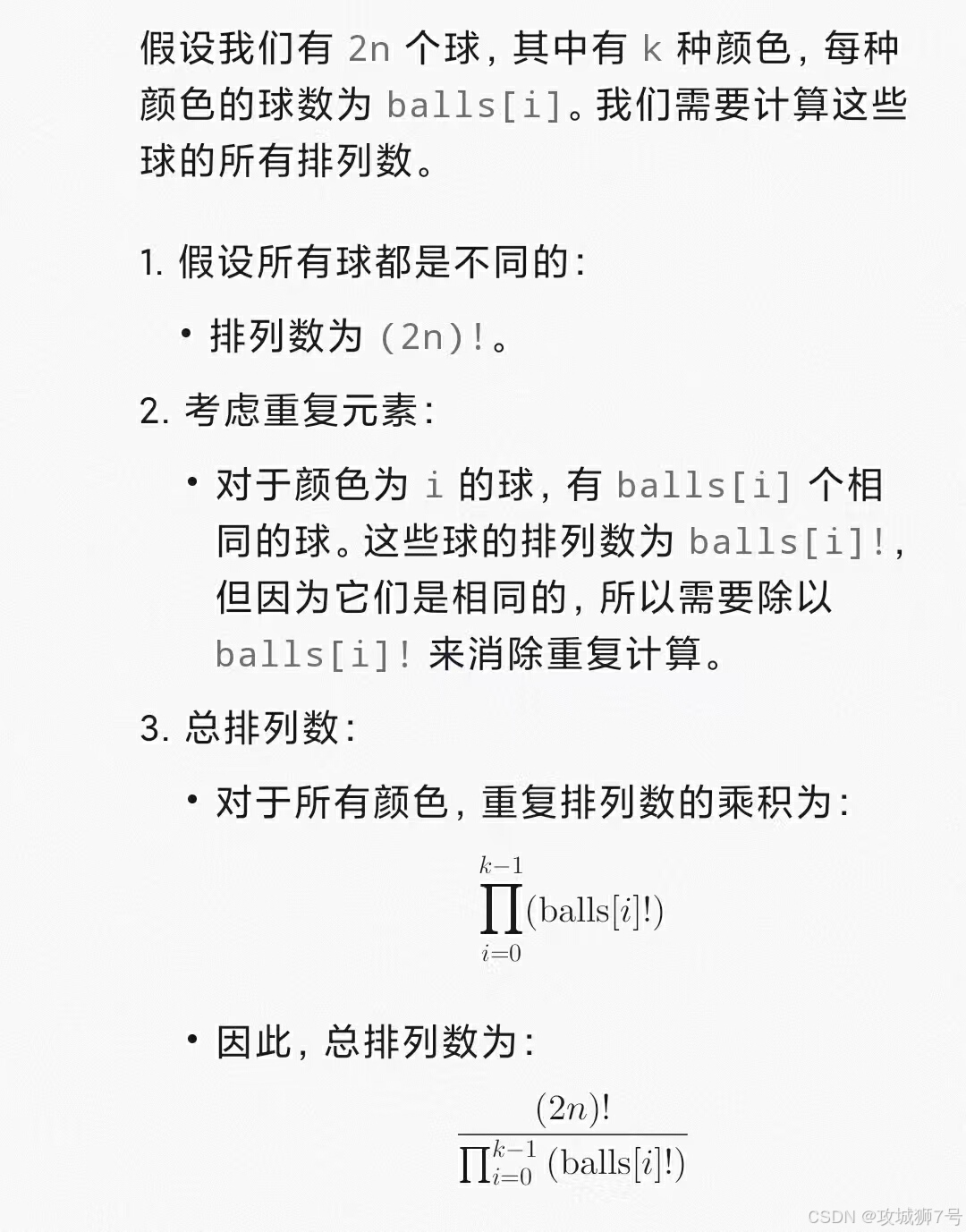 1. **总分配方式**:首先,我们需要计算所有可能的分配方式的总数。由于有 `2n` 个球,其中每种颜色的球有 `balls[i]` 个,总分配方式数为所有球的多重排列数,推导过程如下: