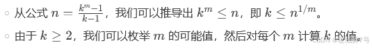 m的最大值可以通过 log2(n) 来确定,因为 k≥2 时,m 的最大值是 log2(n)。