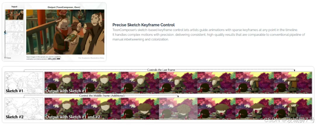 这样一来,AI就不再是盲目地模仿草图的画风,而是能够精准地理解:“哦,在第1秒时,角色应该是这个站立的姿态;在第3秒时,他要跳到这个空中姿态。” 哪怕动画师只提供了这两张草图,AI也能在它们之间生成平滑、合理的过渡动作。这个机制赋予了艺术家前所未有的控制力,让他们可以用最少的工作量,精确地主导动画的走向。
