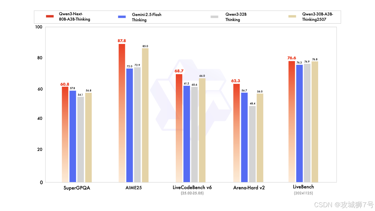 `Qwen3-Next-80B-A3B-Thinking` 则是一个专注于复杂推理的模型。在多个基准测试中,它的性能全面超过了谷歌强大的闭源模型`Gemini-2.5-Flash-Thinking`,并在一些关键指标上接近`Qwen3-235B`的思维模型。这标志着开源模型在推理能力上,正迎头赶上甚至超越一些顶级的闭源模型。