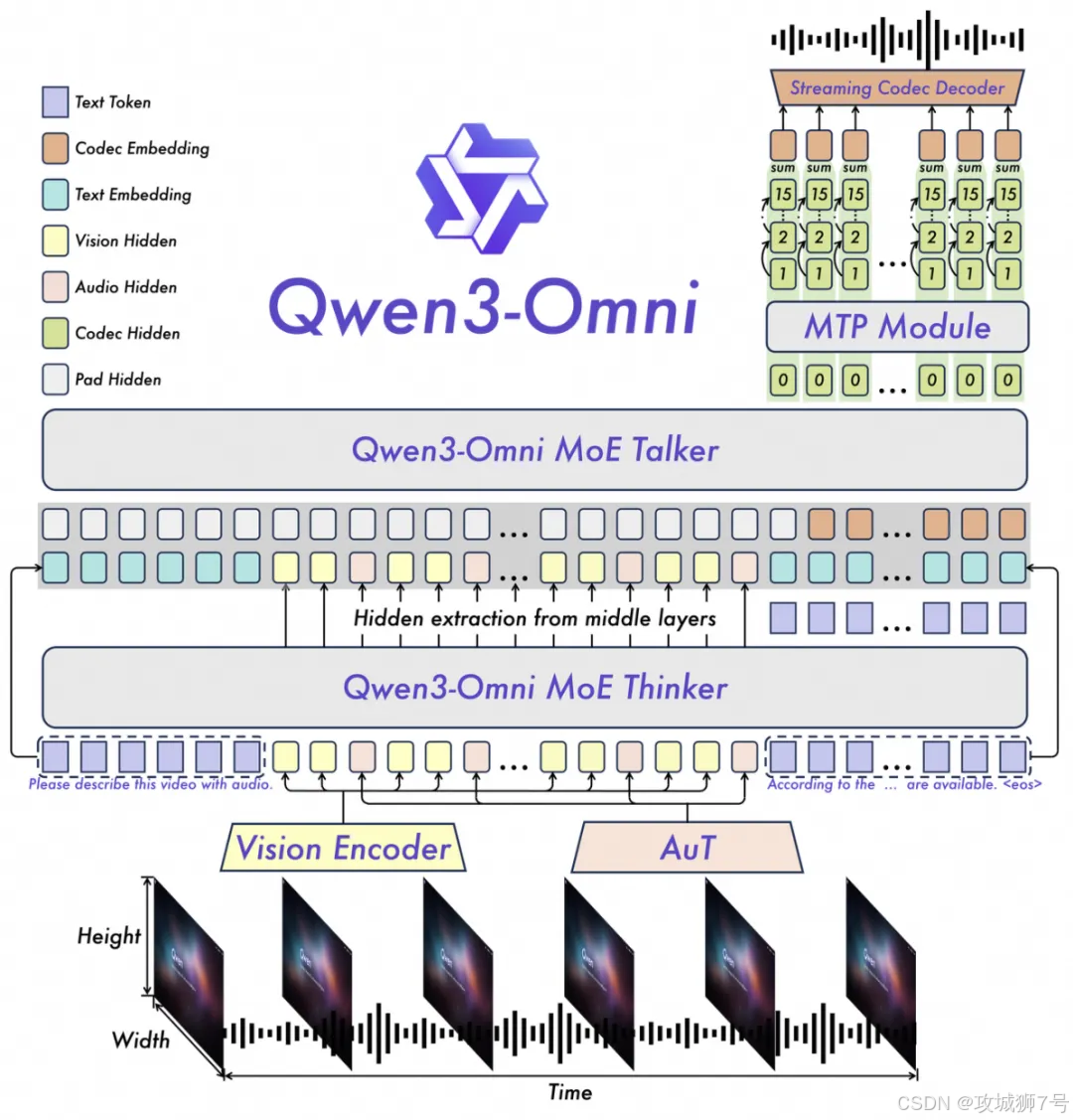 (2)表达者(Talker):这是模型的“嘴巴”,同样基于MoE架构。它不直接处理复杂的逻辑,而是接收来自“大脑”(Thinker)处理好的高层语义信息,然后专注于一件事——如何把这些意思用流畅、自然的语音实时说出来。