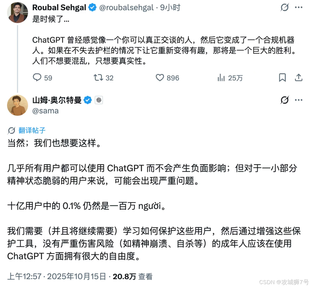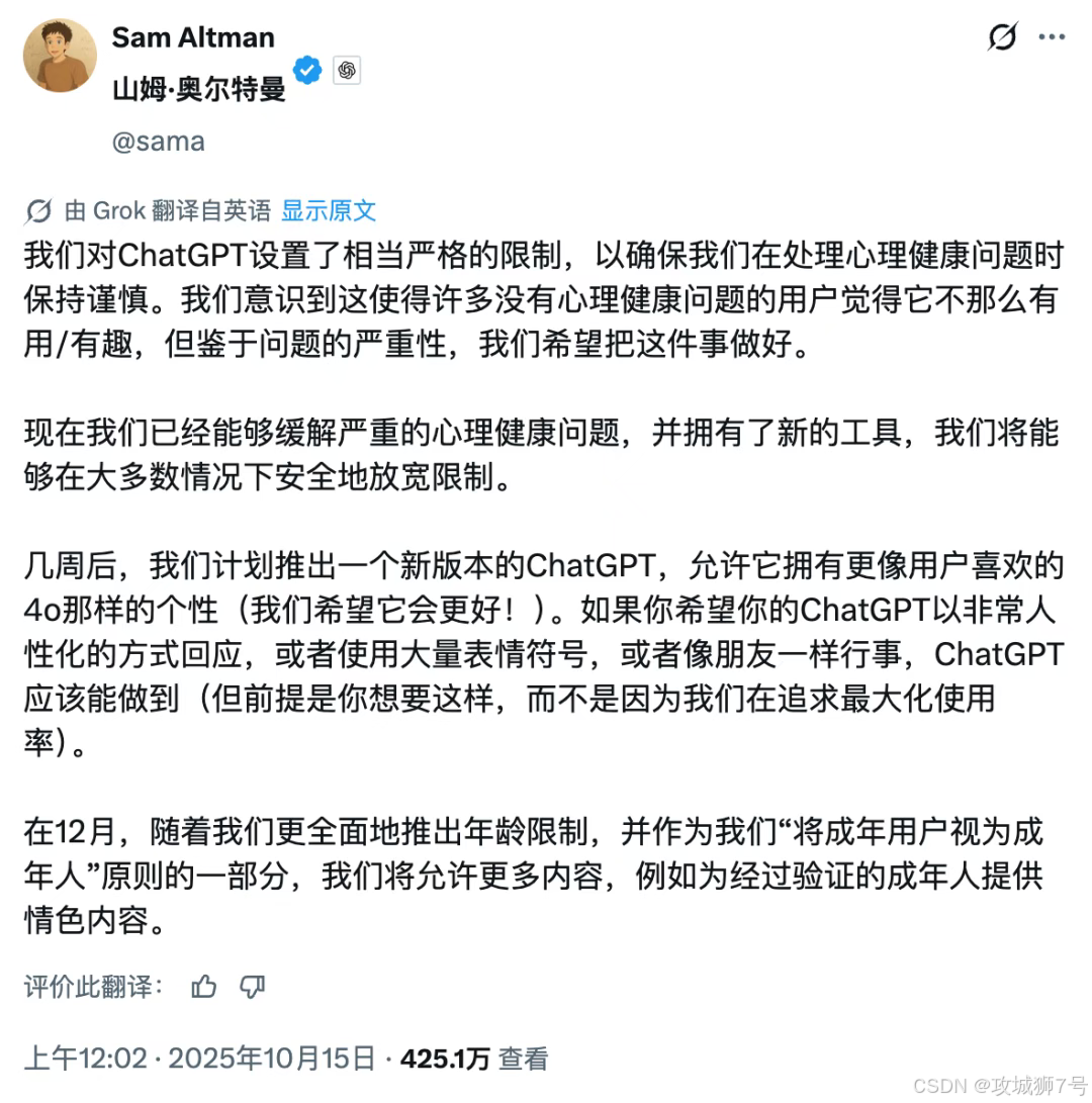 2025年十月中旬,OpenAI的CEO山姆·奥特曼投下了一颗重磅炸弹:从12月起,ChatGPT将为通过年龄验证的成年用户,解锁“成人模式”,允许生成包括情色内容在内的、此前被严格限制的产出。