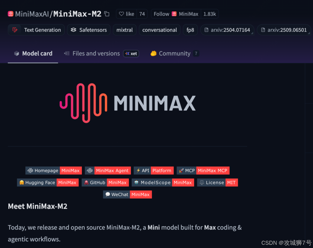 MiniMax-M2的开源地址为:https://huggingface.co/minimaxai/minimax-m2