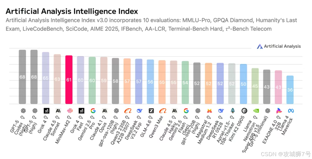 在全球知名的AI模型评测榜单Artificial Analysis (AA)上,M2的总分冲入全球前五,在所有开源模型中排名第一,甚至超越了谷歌的Gemini 2.5 Pro和Anthropic的Claude 4.1等闭源强手。