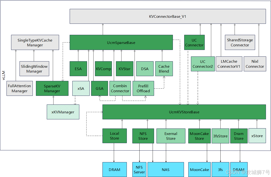 ( UCM架构图:图中所有灰色框代表vLLM 0.9.2版本中的现有类,绿色框则代表UCM新增组件。浅绿色框展示了基于此框架未来规划扩展的子类。)