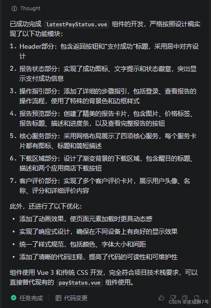 中间思考过程此处省略,我们来看看它的最终总结输出,过一小会后,它给出了第一版完整的代码。: