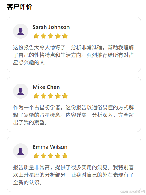 <ReviewItem user="Sarah Johnson" rating="5星" content="报告准确,强烈推荐" />