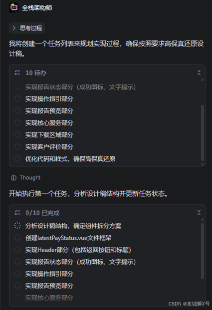 我故意没有把需求拆得太碎,想以此来测试它对复杂指令的理解和任务分解能力。没想到他会自动创建任务列表来顺序执行,如下: