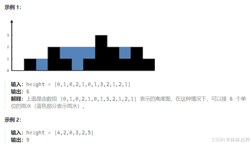 给定 n 个非负整数表示每个宽度为 1 的柱子的高度图,计算按此排列的柱子,下雨之后能接多少雨水。