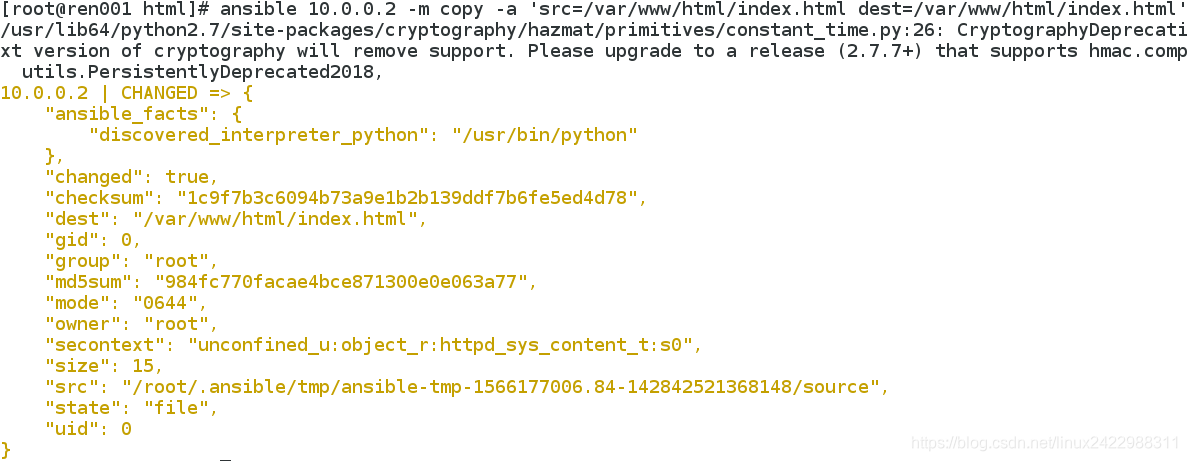 3.将index.html好并复制到被控端下,咱们写的是 'hello,Ansible"
