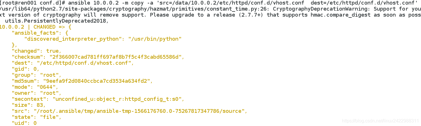 可以看出,用ad-hoc来操作,是比直接操作更加麻烦的,ansible突出的优势是控制多机.咱们操作的是指定IP地址,可以把有共同性的IP地址放入一个组中,然后指定组,控制多机.