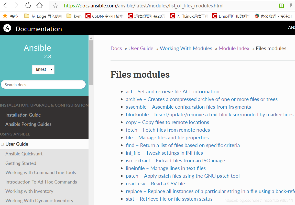 当然了,这些ad-hoc,比如说,copy,package,systemd...一些都是ansible中的模块,都没有细节描述出来,给大家推荐ansible的官网,里面完整的介绍和使用方法. https://docs.ansible.com/