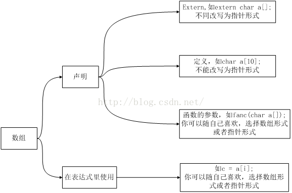 图2-1,中说明了数组除了在作为函数参数或者在表达式中作为右值,其他情况情况下其与指针均不相同。