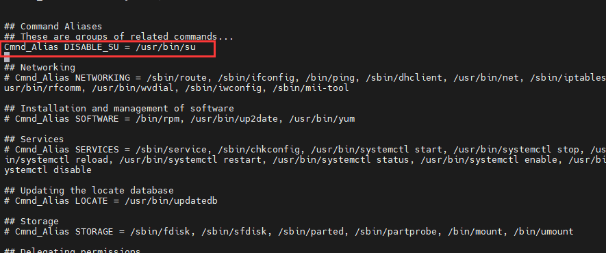 Cmnd_Alias DISABLE_SU = /usr/bin/su