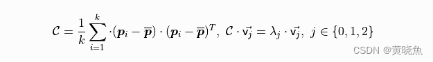 因此,估计表面法线的解决方案简化为 特征向量和特征值(或 PCA – 主成分)的分析 分析)从 查询点。更具体地说,对于每个点,我们 按如下方式组装协方差矩阵:
