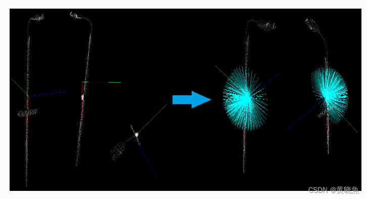 特征提取方法的思路如下。 首先计算点云的协方差矩阵,提取其特征值和向量。 您可以认为生成的特征向量已归一化,并且始终形成右手坐标系 (主要特征向量表示 X 轴,次要矢量表示 Z 轴)。在下一步中,将进行迭代过程。 在每次迭代中,主要特征向量被旋转。旋转顺序始终相同,并且围绕另一个执行 特征向量,这提供了点云旋转的不变性。此后,我们将这个旋转的长向量称为当前轴。