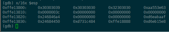 不知道你是否发现了,栈顶向下的内容是0x30303039这样的东西,这东西一看就像字符串,别问我为什么,这是经验加敏锐的直觉,哈哈.那我们看看这是什么字符串:
