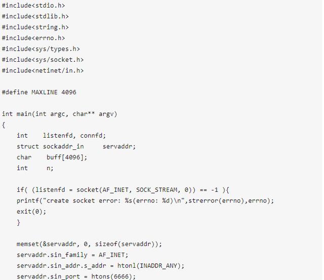 当然上面的代码很简单,也有很多缺点,这就只是简单的演示socket的基本函数使用。其实不管有多复杂的网络程序,都使用的这些基本函数。上面的服务器使用的是迭代模式的,即只有处理完一个客户端请求才会去处理下一个客户端的请求,这样的服务器处理能力是很弱的,现实中的服务器都需要有并发处理能力!为了需要并发处理,服务器需要fork()一个新的进程或者线程去处理请求等。