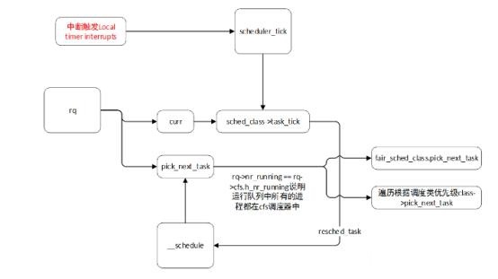 Tcik 中断,主要会更新调度信息,然后调整当前进程在红黑树中的位置。调整完成以后如果当前进程不再是最左边的叶子,就标记为Need_resched标志,中断返回时就会调用scheduler()完成切换、否则当前进程继续占用CPU。从这里可以看出CFS抛弃了传统时间片概念。Tick中断只需要更新红黑树。