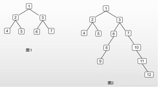 图1树的最长路径长度为4,图2的最长路径长度为7,图1最长路径经过根节点,顶点为1,图2不经过,顶点为3
