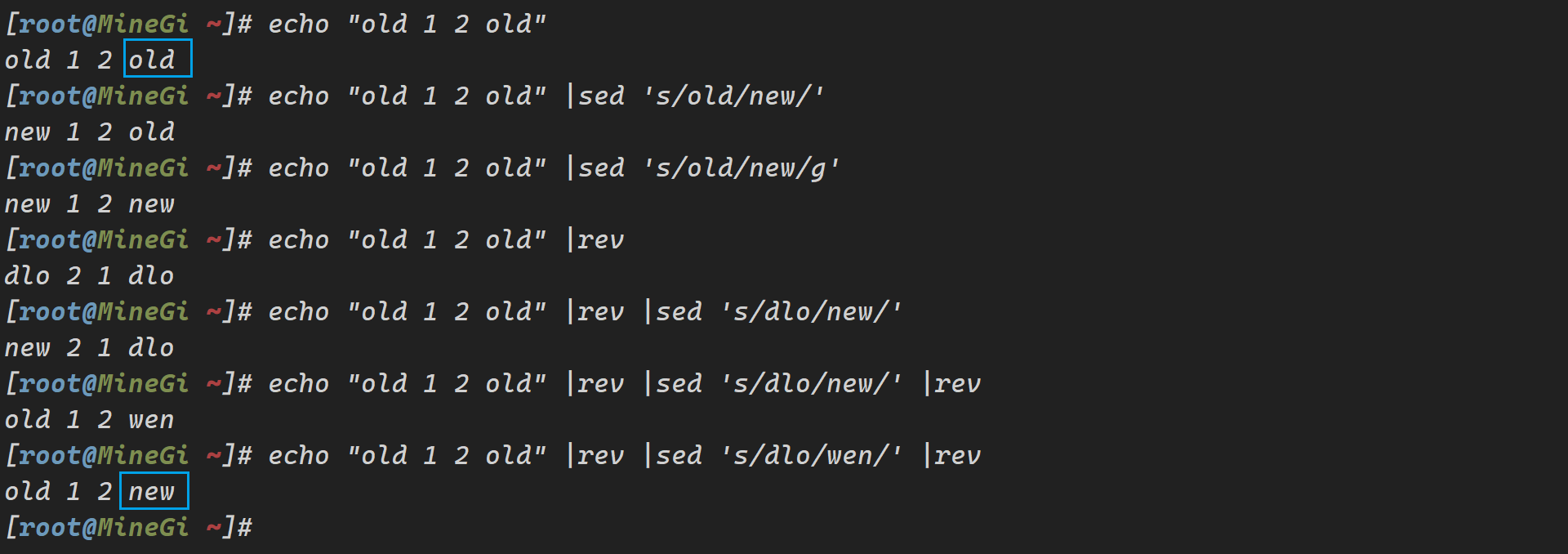 [root@MineGi ~]# echo "old 1 2 old"