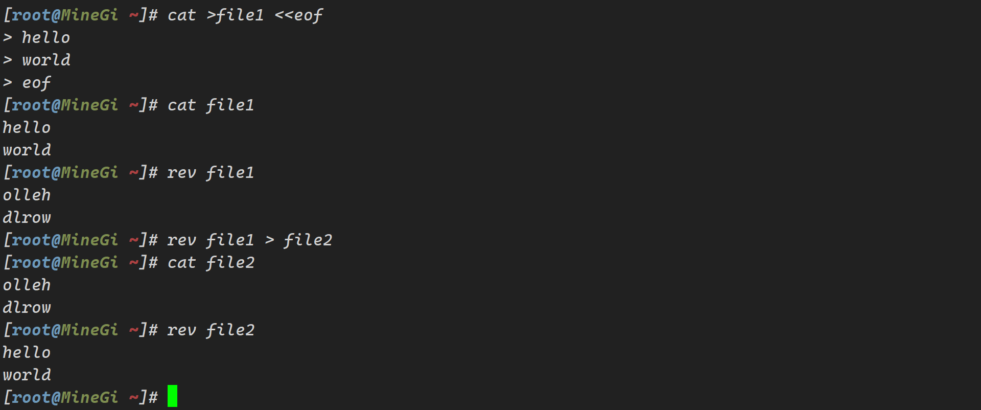 [root@MineGi ~]# cat >file1 <<eof