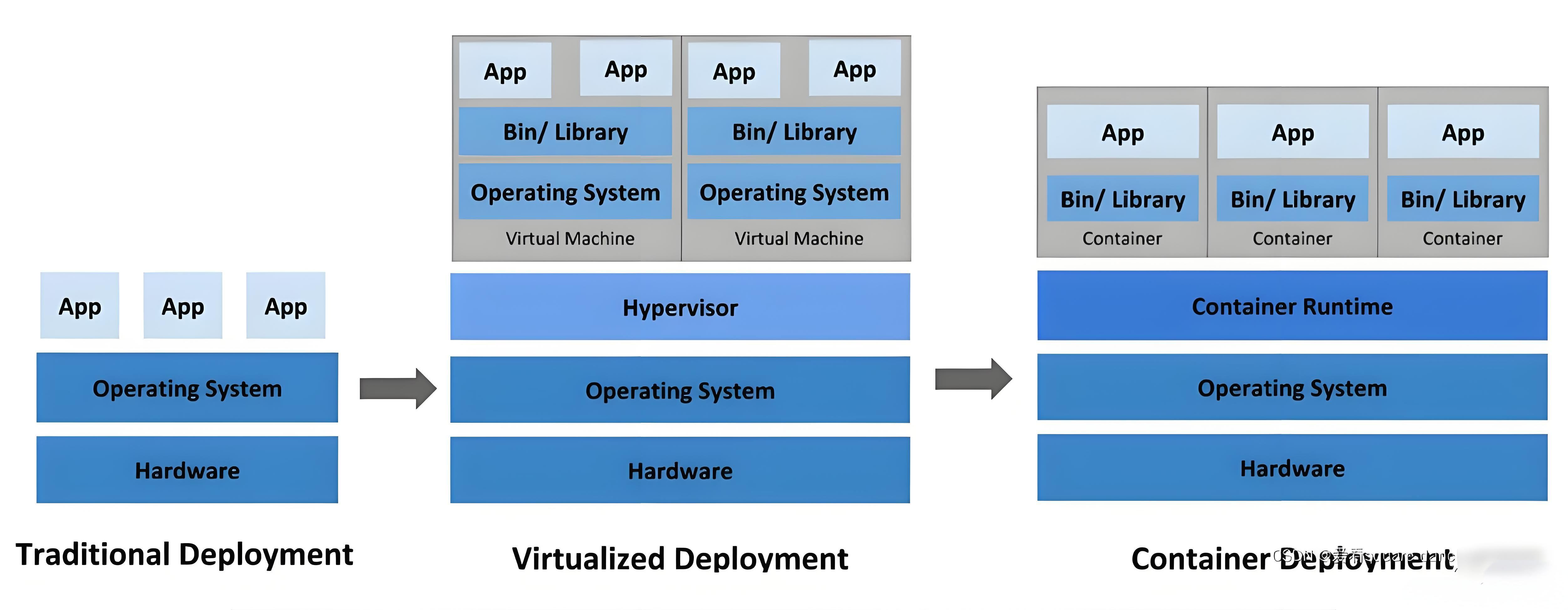 传统部署 ----> 虚拟机部署 ----> 容器化部署的演变如下图所示: