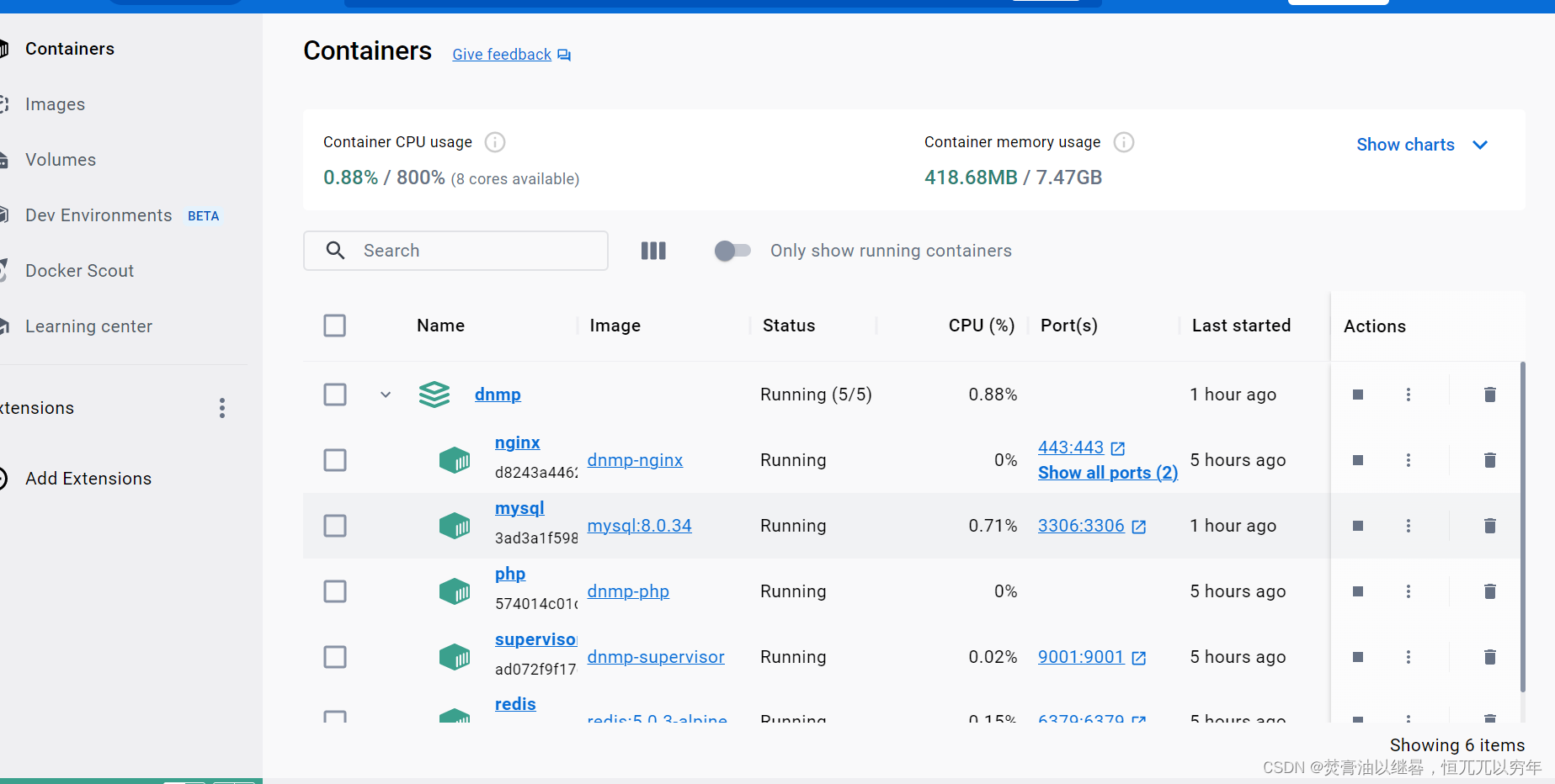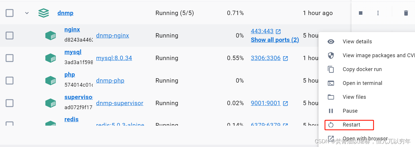 以上程序执行完成后,在docker-desktop中便能看到dnmp中所定义的镜像软件环境内容了