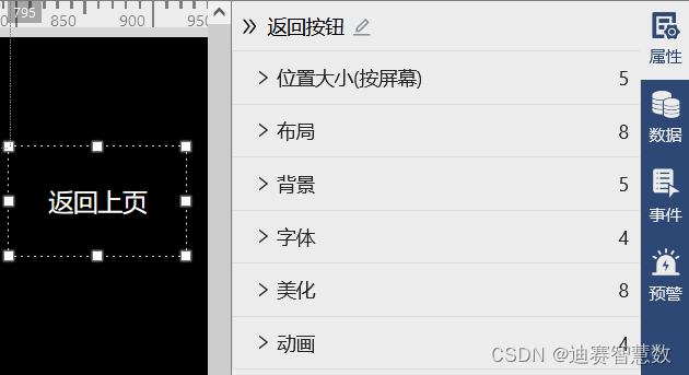 今天和往常一样用着迪赛智慧数据可视化平台做医院的一些数据统计,恰巧发现了一个比较实用、好玩的组件:“返回按钮”。相对于传统的返回按钮来说,迪赛智慧数的按钮还是比较多样化、调皮的。