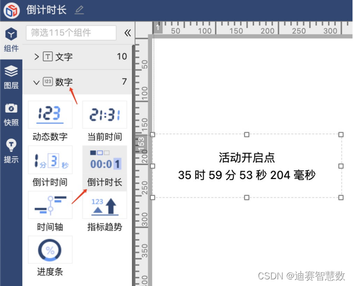 点击左侧组件分类中的数字一栏展开即可看到倒计时长,点击该组件或者直接用鼠标拖拽该组件即可将ta添加到画布中。