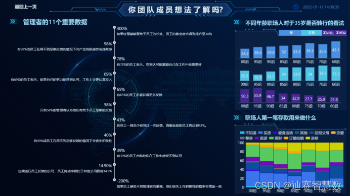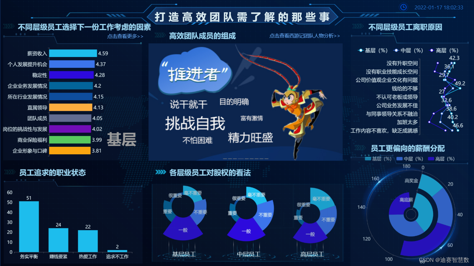 团队并不是由一群完美无缺的成员组成的,而是由各有不同的人组成,管理者要设法发挥团队成员各自的优点,减弱缺点,只有这样才能组成一支高效的团队。那打造一支高效团队需要了解哪些事儿呢?小编从团队成员的组成、员工在职场中的看法及管理者需要注意的事项,配合可视化数据大屏进行详细说明。