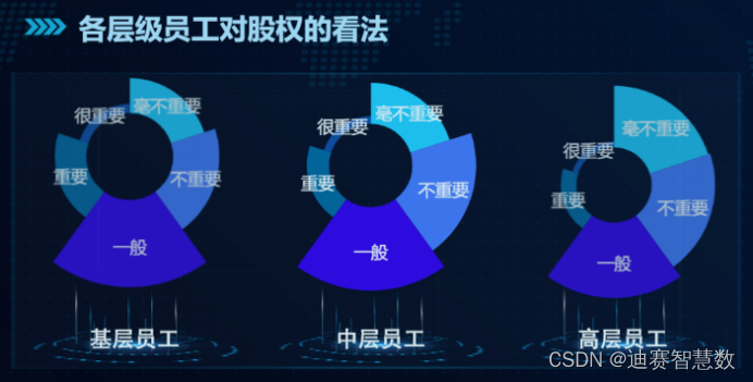 基层、中层和高层员工,对于股权的重要程度大部分人都持一般看法;高层员工认为股权毫不重要的占比27.7%,远高于基层和高层员工;基层、中层和高层员工均只有少部分人认为股权很重要。