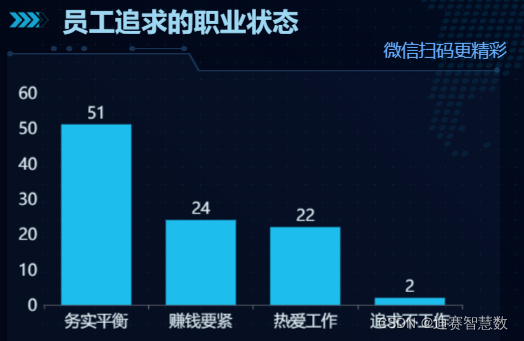 职场人们最理想的职业状态,有51%的职场人追求务实平衡,既能保证工作又能过好生活;有24%的职场人更看重薪资,赚钱要紧;还有22%的人更喜欢做自己热爱的工作,更爱有挑战性的工作;还剩2%的职场人追求不工作。
