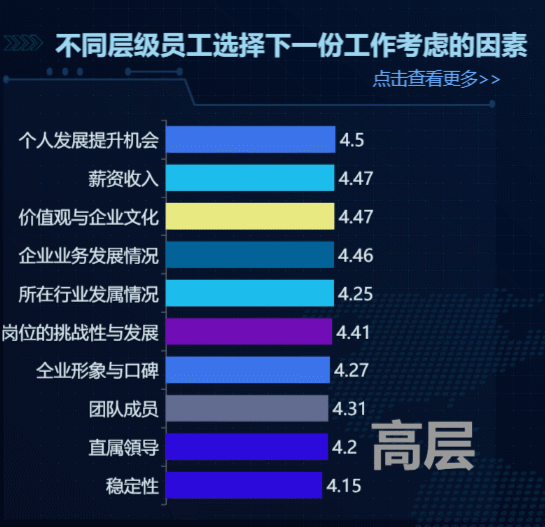 高层相对基层和中层员工更看重价值观和企业文化,公司的价值观和企业文化,是否与之匹配,这一点将决定在这家公司成长的速度与职业发展高度,因此高层的员工更看重这个因素。