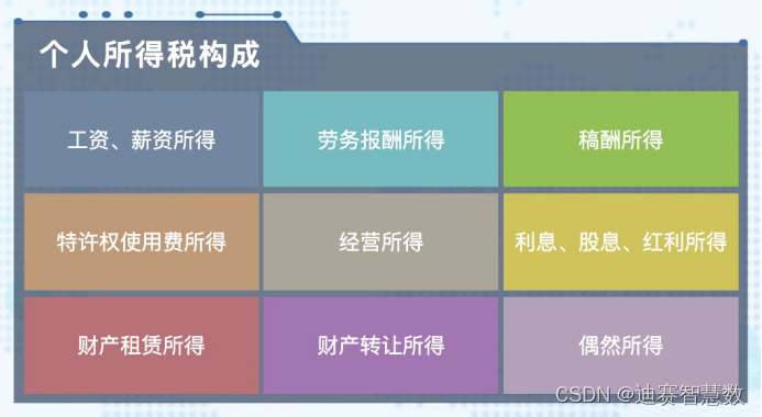 本文介绍并分析了个人所得税的主要构成部分,包括工资、薪资所得,劳务报酬所得等九项收入来源。