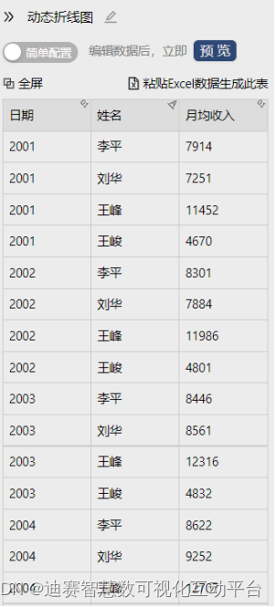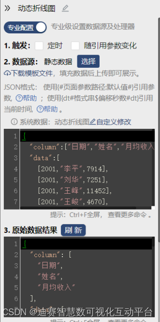 接下来看一下如何配置数据。平台提供两种模式:简单配置、专业配置。两种模式可以自由切换。现有的数据格式模板非常便于理解,大家只需要在此基础上修改即可,如果数据量较大,还能直接粘贴excel数据生成图表。