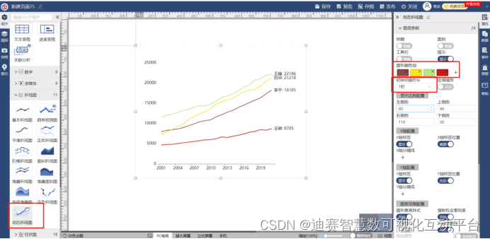 下面我们来感受一下,首先找到折线图把动态折线图组件拖入画布中。
