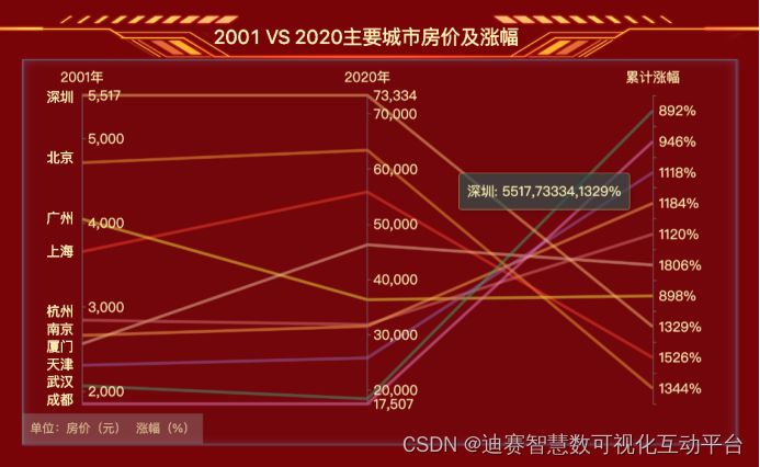 从2001年至2020年,中国主要城市房价经历了显著增长,如北京房价涨幅达1344%,上海涨幅1526%。各城市房价涨幅差异明显。
